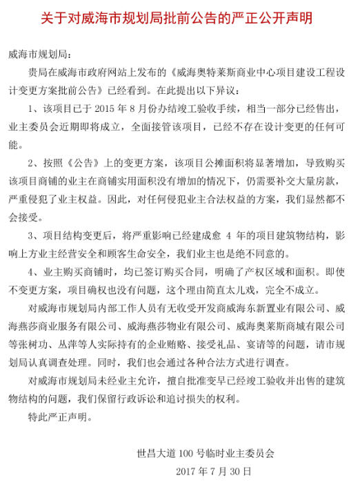 威海市规划局:威海市规划局: 贵局在威海市政府网站上发布的《威海奥特莱斯商业中心项目建设工程设计变更方案批前公告》已经看到。在此提出以下异议: 1、该项目已于2015年8月份办结竣工验收手续,业主委员会近期即将成立,全面接管该项目,已经不存在设计变更的任何可能。 2、按照《公告》上的变更方案,该项目公摊面积将显著增加,导致购买该项目商铺的业主需要补交房款,严重侵犯了业主权益,因此对任何侵犯业务合法权益的方案,我们都不会接受。 3、项目增加门后,将严重影响已经建成愈4年的项目建筑物结构,影响上方业主经营安全和顾客生命安全,我们业主也是绝不同意的。